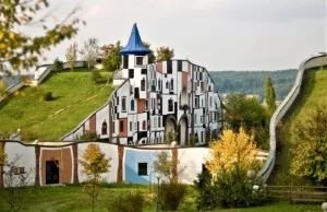In the 1950s, Hundertwasser turned to architecture. He began designing buildings with features such as undulating floors, and trees growing through rooms. He had grown up with the Bauhaus angular cleanliness, all carefully measured and efficiently segmented. He was utterly opposed to this, and developed new shapes, such as the spiral house and the eye-slit house, and became an advocate for environmentally-friendly buildings.